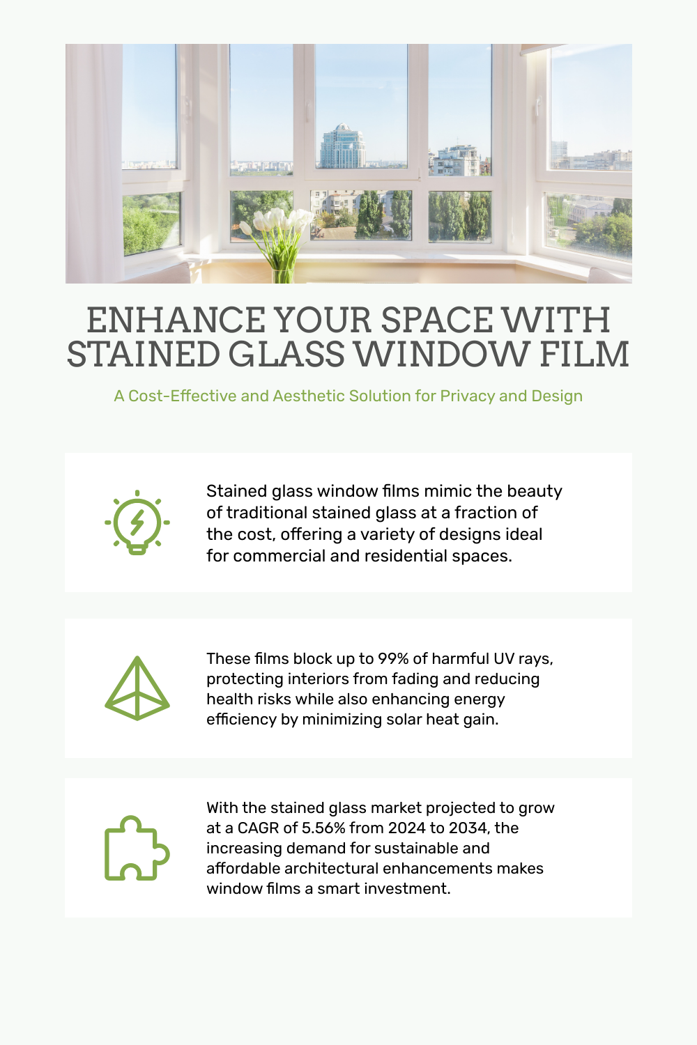 Moreover, the global market for stained glass, which includes stained glass window film, is on a rise. It is projected to grow at a CAGR of 5.56% from 2024 to 2034, indicating increasing popularity and adoption[source]. This growth is likely driven by the expanding awareness of the benefits of window films alongside the global appreciation for sustainable and cost-effective building enhancements.